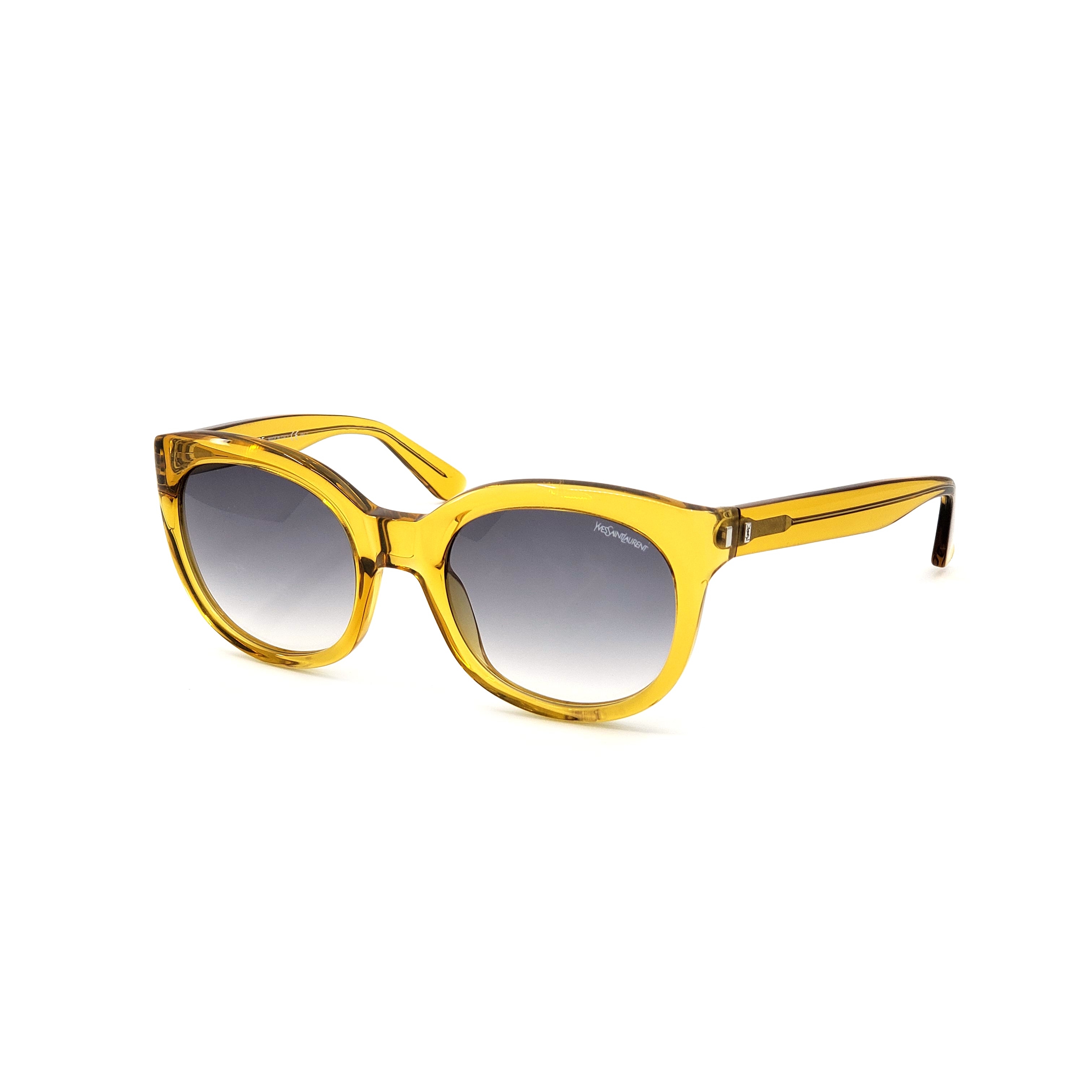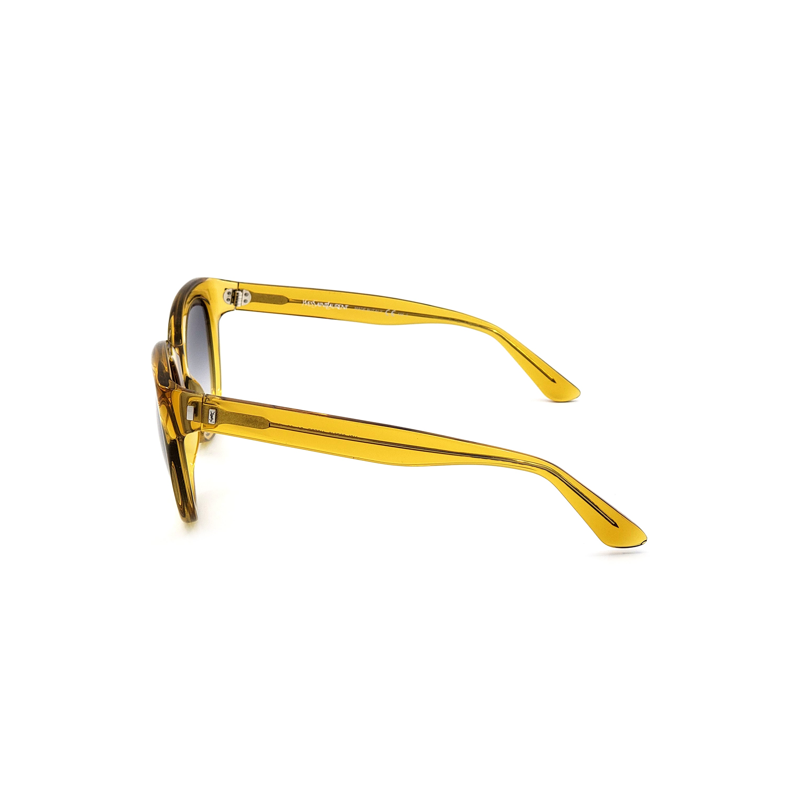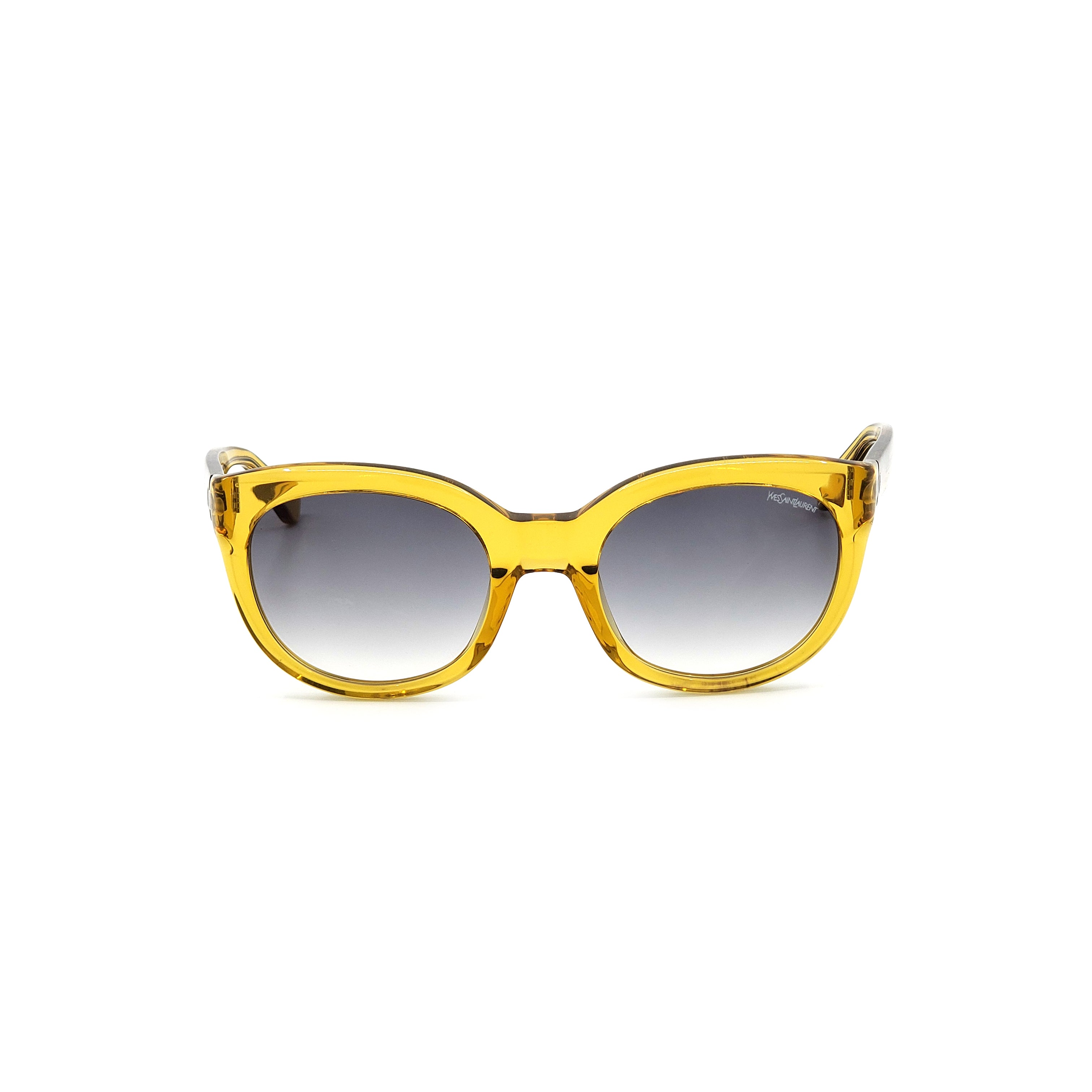 YSL's groundbreaking styles have become iconic cultural and artistic references.  The YSL6379S-HSF model features a candy yellow frame and gray gradient lenses with 100% UVA/UVB protection. Size: 54-22-135.