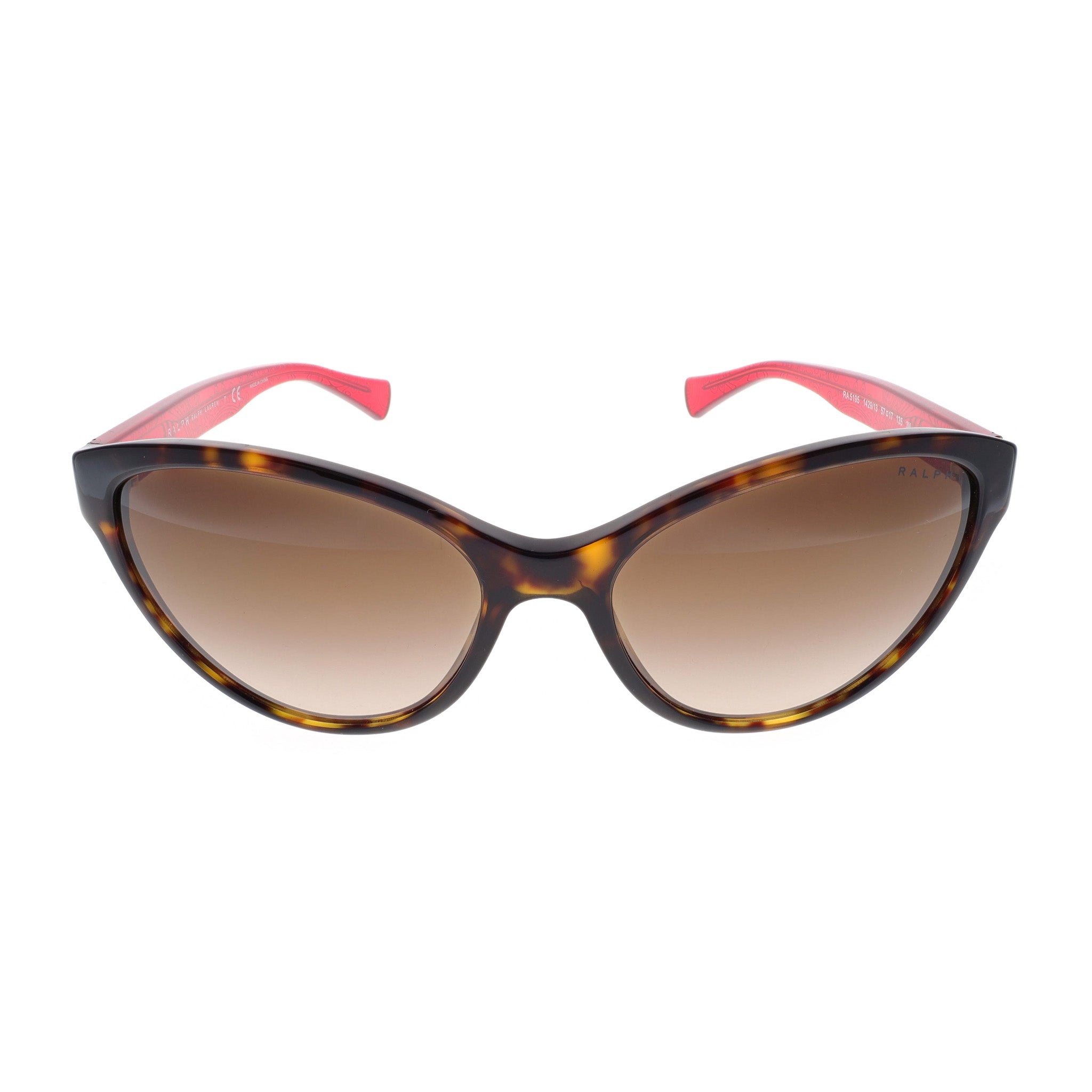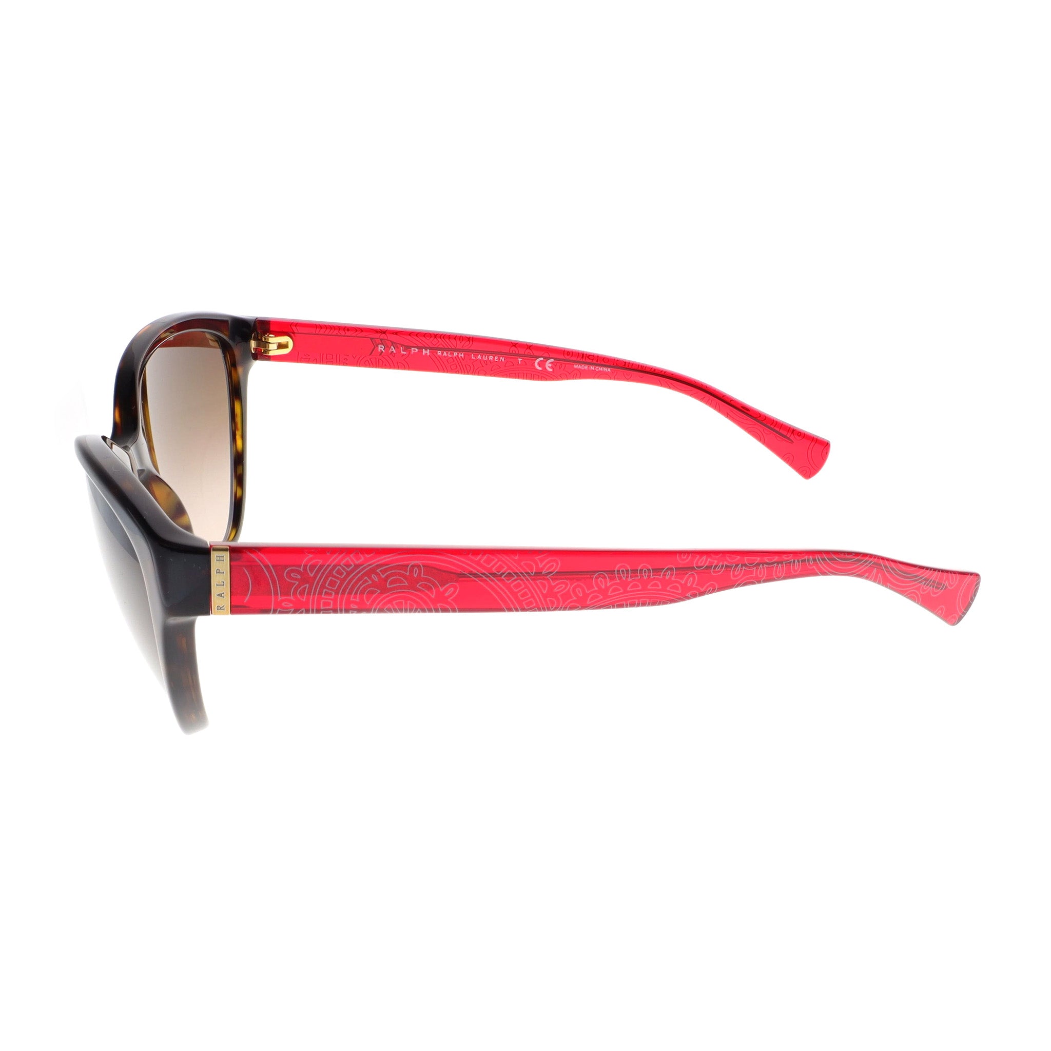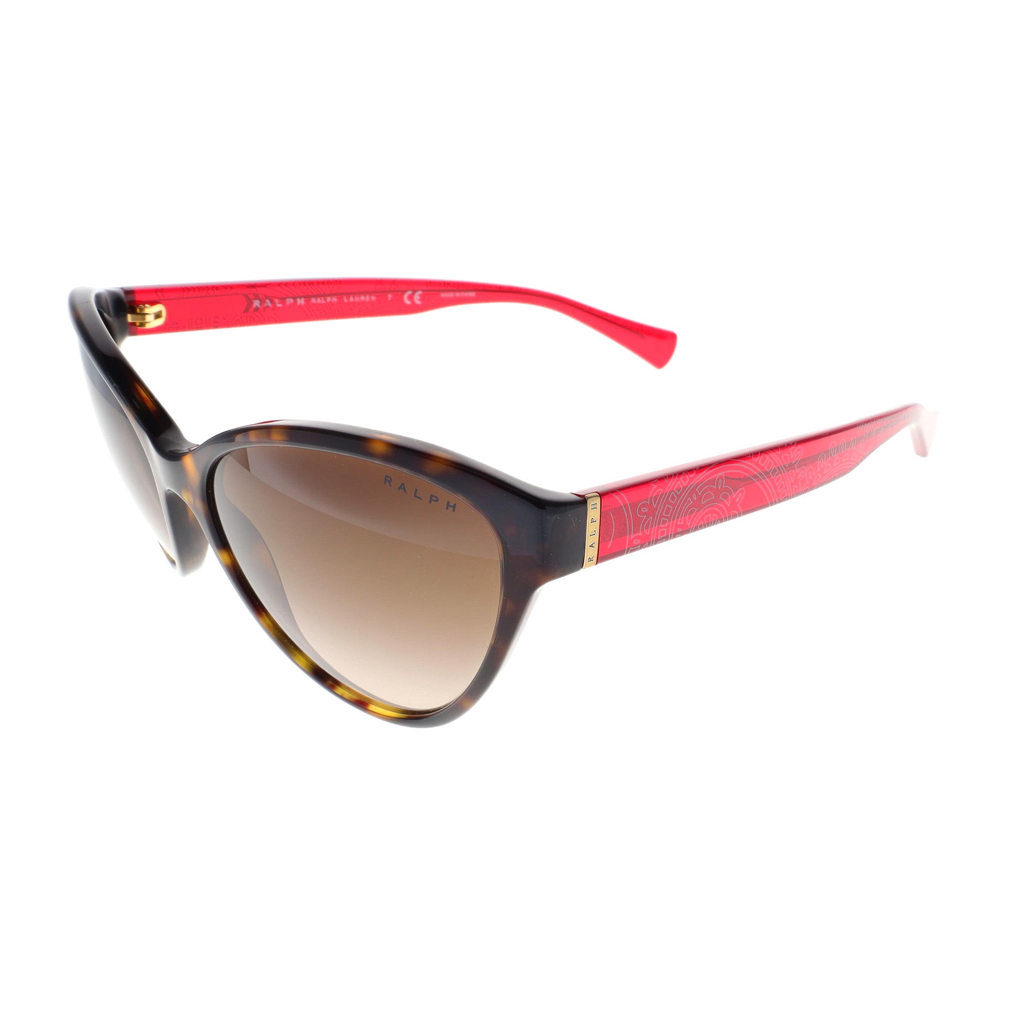 Elevate your style with Ralph Lauren's medium cat eye sunglasses, designed for women who appreciate a blend of classic elegance and modern sophistication. The medium-sized frame ensures a comfortable fit, featuring a lens width of 55 mm, bridge width of 18 mm, and temple length of 135 mm. Crafted from high-quality acetate, the rich brown frame and red bandana temples add a touch of luxury to your look. The brown gradient lenses not only enhance your style but also provide 100% UV protection, safeguarding your eyes from harmful rays. Perfect for any occasion, these sunglasses embody the superior craftsmanship and iconic design associated with Ralph Lauren. Add a touch of glamour to your accessory collection with these timeless cat eye sunglasses.
