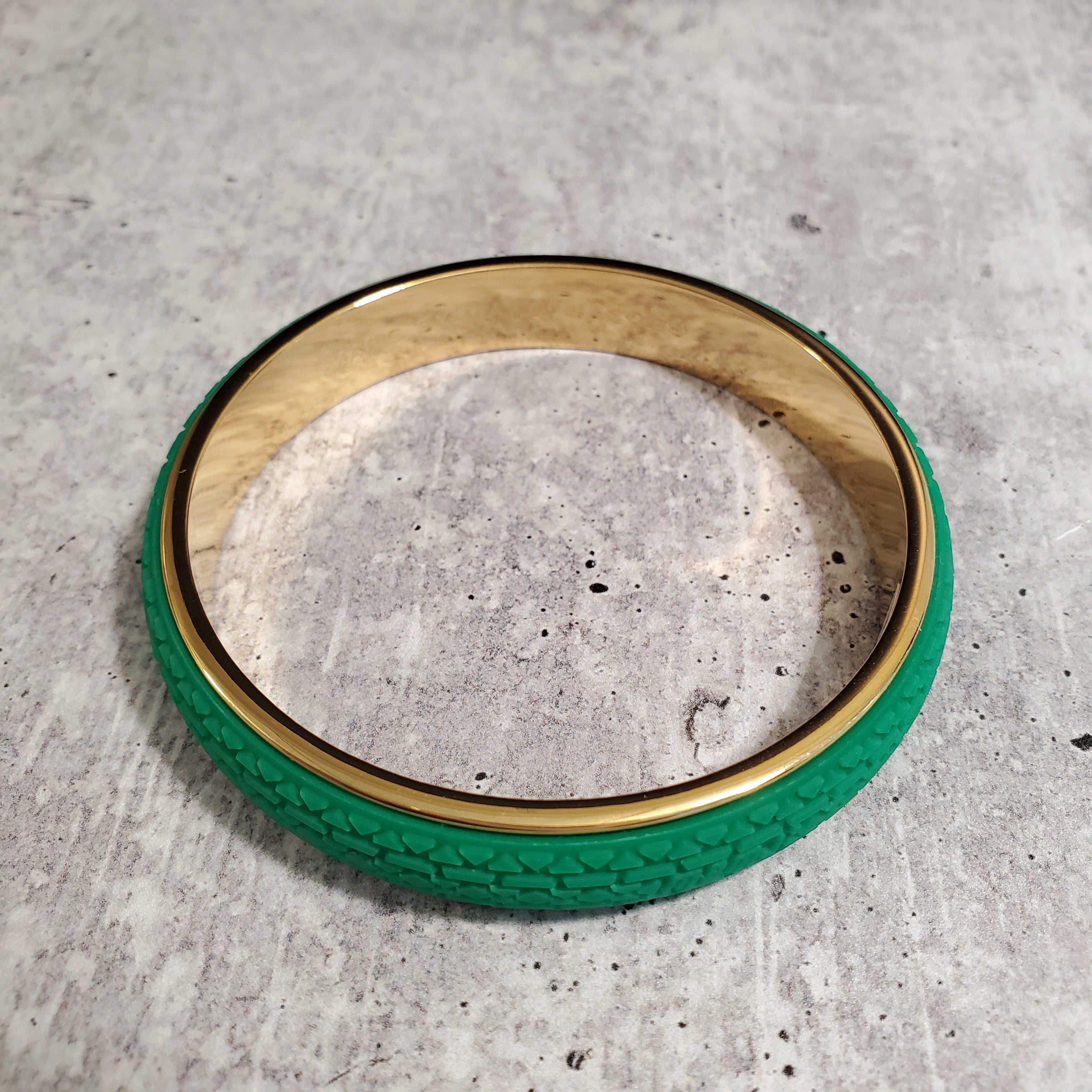Logoed tread marks run around a rubber-lined bangle distinctly inspired by the rough-and-tumble world of road biking. Sporty, unique and stylish. Sold out edition.