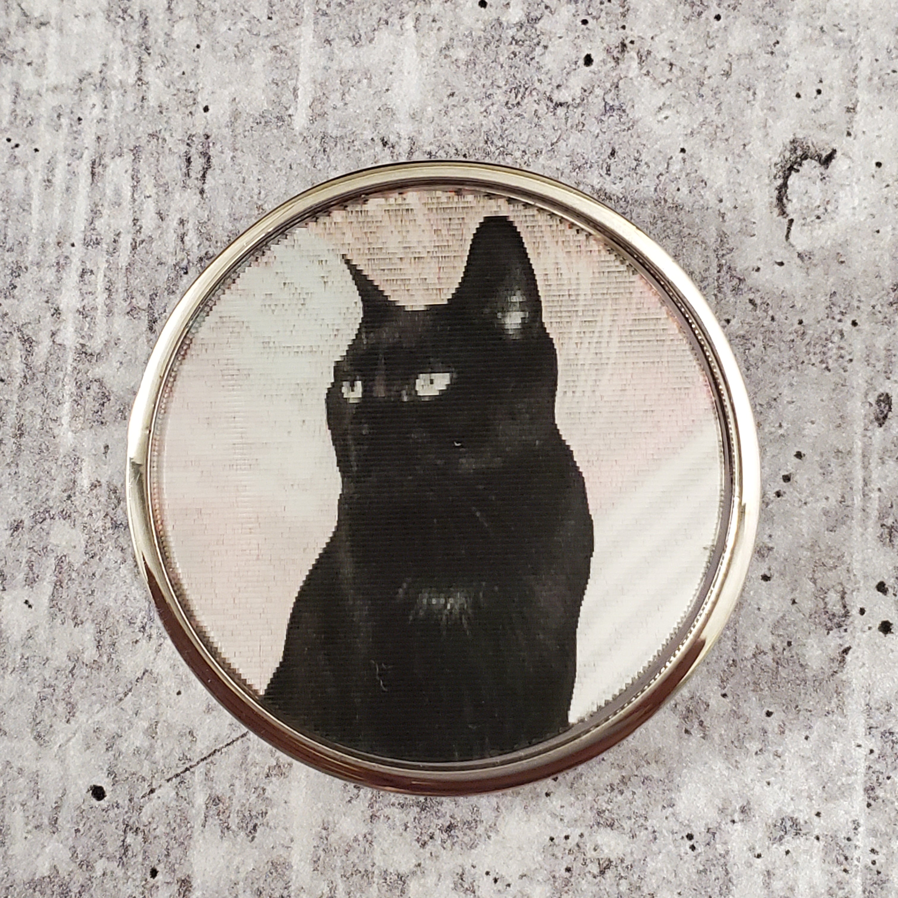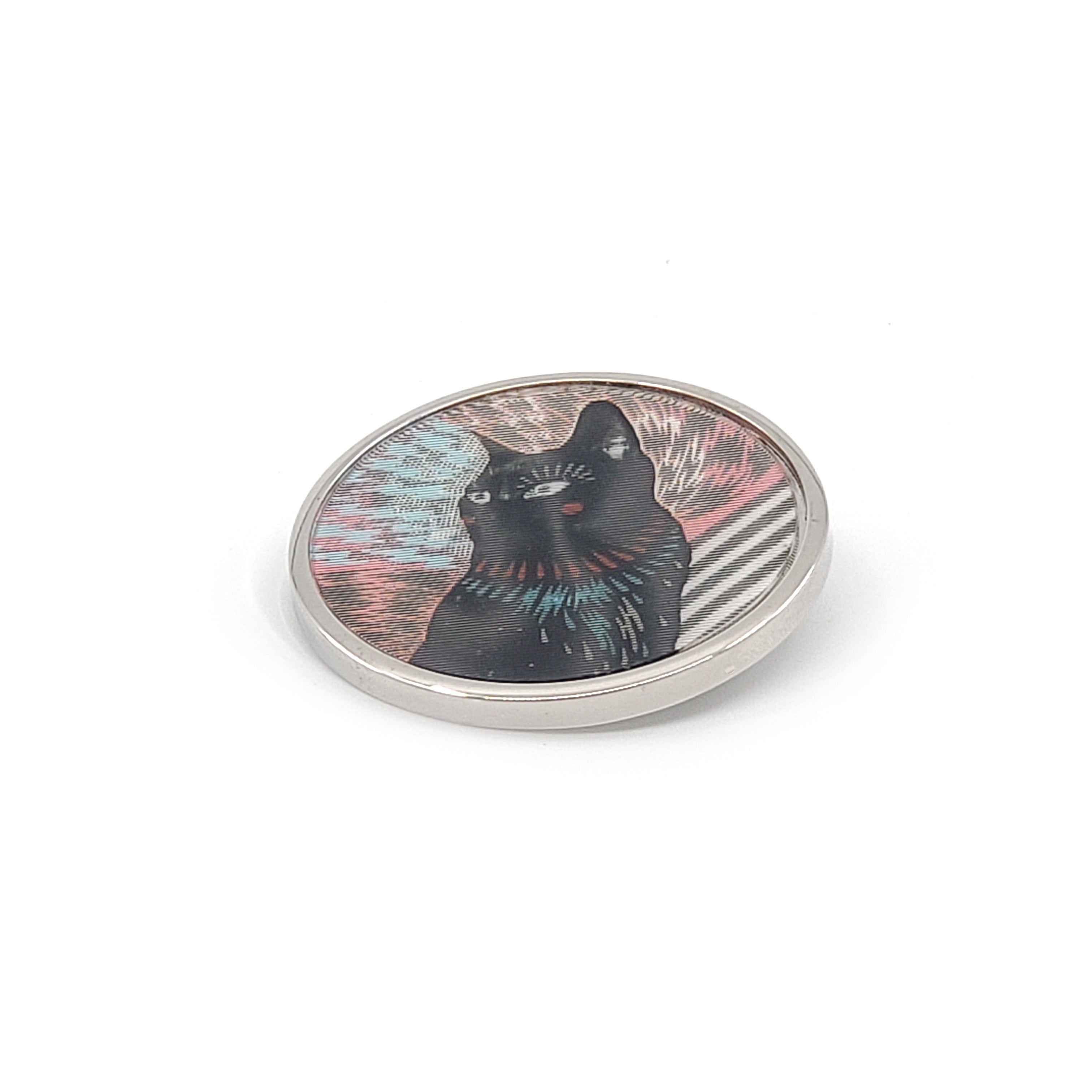 Introducing the Marc by Marc Jacobs Lenticular Rue Cat Statement Pin. This unisex accessory, featuring a lenticular design, comes in one size, making it versatile for various styles. The image changes depending on the viewing angle. Features a groovy black cat. Sold out edition. Matching ring sold separately.