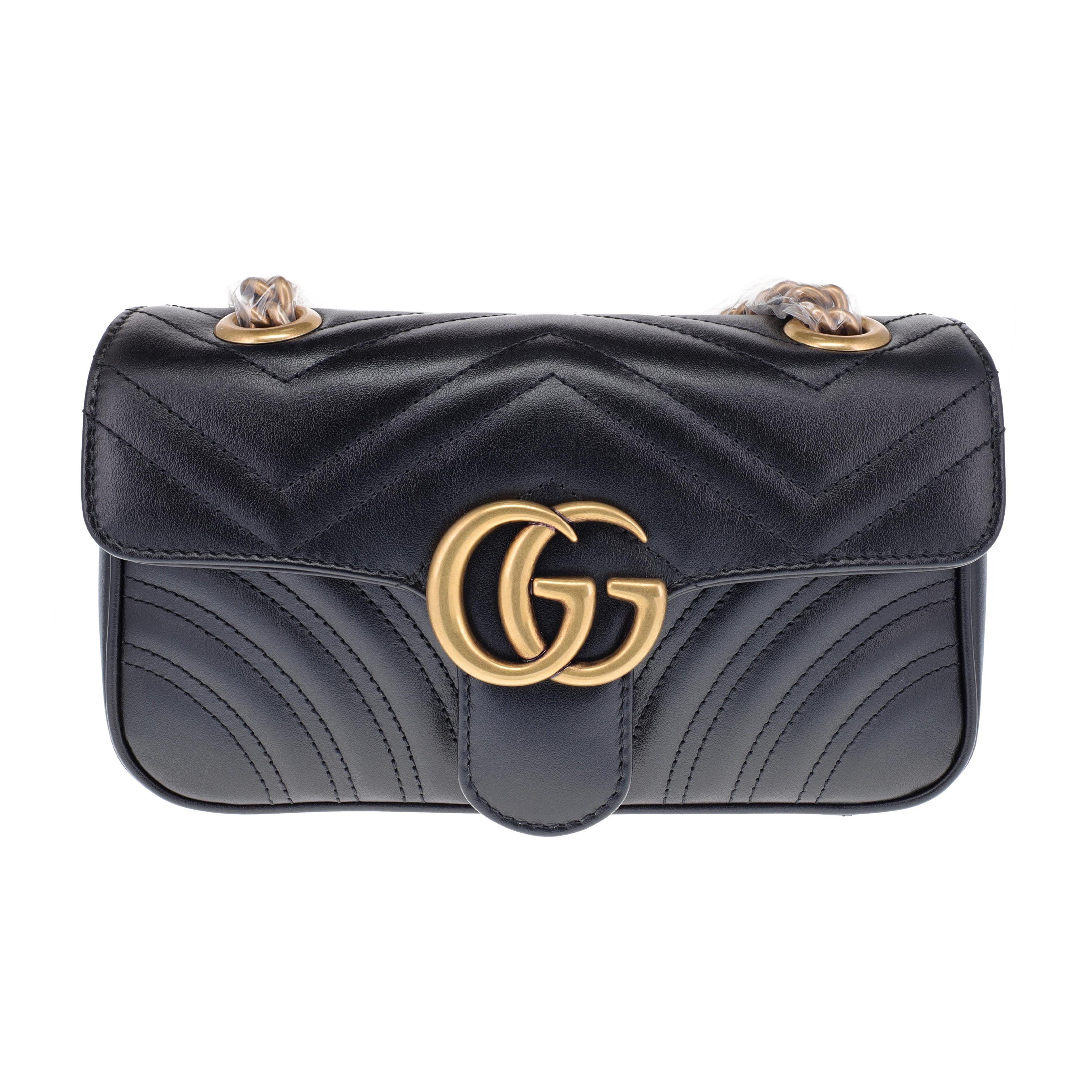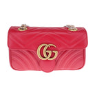 The small GG Marmont flap bag has a softly structured shape and an flap closure with Double G hardware. The sliding chain strap can be worn multiple ways, changing between a shoulder and a top handle bag. Made in matelassé chevron leather with a heart on the back.