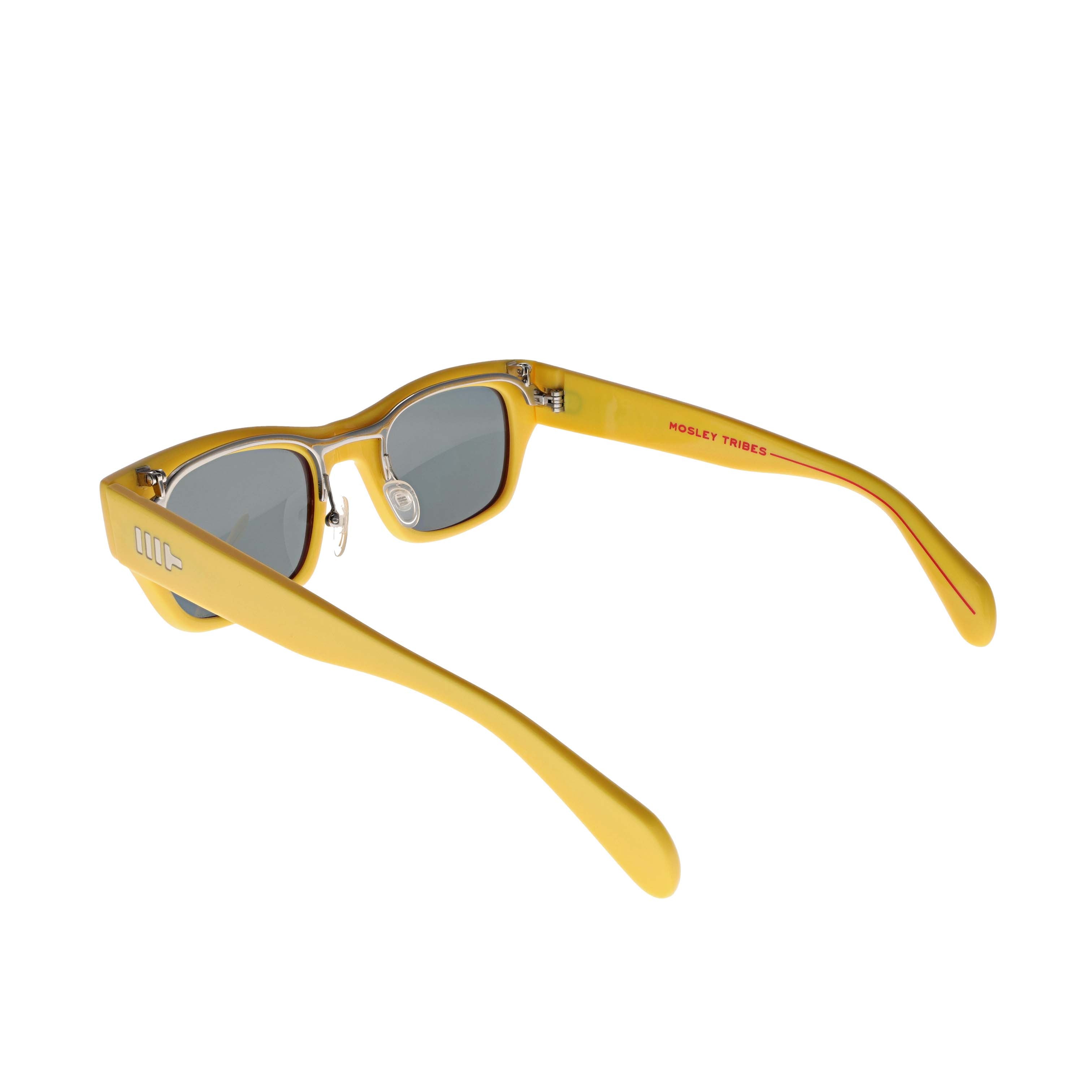 The Mosley Tribes Gates sunglasses in vibrant yellow with gray lenses are a rare find. Model: MTGATES-YEL. Size: 50-22-145. Featuring yellow frames and gray lenses with 100% UVA/UVB protection. These sunglasses boast folding gates and an anti-reflective coating on the inside of the lens for optimal clarity.